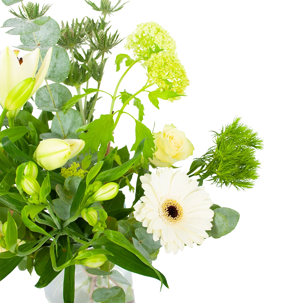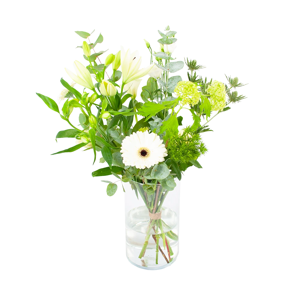 Met Boeket Wit gebaar haal je een prachitg wit boeket in huis! Geniet van de mooiste witte bloemen. Altijd vers van de kweker! Verwen jezelf of verras iemand anders met een prachtig boeket. *Exclusief accessoires en vaas.